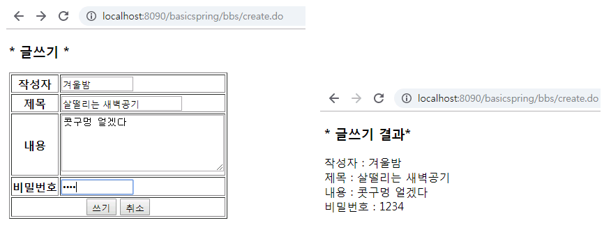 ->각 setter 와 getter 함수가 있어야 한다.@RequestMapping(value="bbs/create.do",method=RequestMethod.GET) public String bbsForm() { return "bbs/bbsForm"; }//bbsForm() end @RequestMapping(value="bbs/create.do", method=RequestMethod.post) public ModelAndView bbsInt(BbsDTO dto) { System.out.println("wname : " +dto.getWname()); System.out.println("subject : " +dto.getSubject()); System.out.println("content : " +dto.getContent()); System.out.println("passwd : " +dto.getPasswd()); ModelAndView mav= new ModelAndView(); mav.setViewName("bbs/bbsResult2"); //request영역에 dto 객체 올리기 mav.addObject("dto",dto); return mav; }//bbsInt() end10 line 객체에 담은 bbsResult2 파일을 생성후 테스트 해보자 3. bbsResult2.jsp
