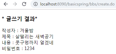 <%@ page language="java" contentType="text/html; charset=UTF-8" pageEncoding="UTF-8"%> <!DOCTYPE html> <html> <head> <meta charset="UTF-8"> <title>bbs/bbsResult.jsp</title> </head> <body> <h3>* 글쓰기 결과*</h3> 작성자 : ${wname}<br> 제목 : ${subject}<br> 내용 : ${content}<br> 비밀번호: ${passwd}<br> </body> </html>4. 결과1