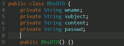 위의 칼럼으로 BbsDTO 를 생성한 후 getter setter를 생성