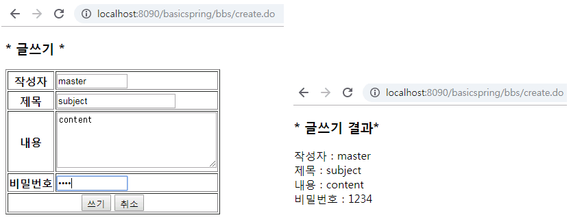 <%@ page language="java" contentType="text/html; charset=UTF-8" pageEncoding="UTF-8"%> <!DOCTYPE html> <html> <head> <meta charset="UTF-8"> <title>bbs/bbsResult2.jsp</title> </head> <body> <h3>* 글쓰기 결과*</h3> 작성자 : ${dto.wname}<br> 제목 : ${dto.subject}<br> 내용 : ${dto.content}<br> 비밀번호: ${dto.passwd}<br> </body> </html>결과