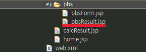 //동일한 요청 명령어를 GET|POST 방식으로 분리해서 호출가능 @RequestMapping(value="bbs/create.do",method=RequestMethod.POST) public ModelAndView bbsIns(HttpServletRequest req) { String wname=req.getParameter("wname").trim(); String subject=req.getParameter("subject").trim(); String content=req.getParameter("content").trim(); String passwd=req.getParameter("passwd").trim(); ModelAndView mav= new ModelAndView(); mav.setViewName("bbs/bbsResult"); mav.addObject("wname",wname); mav.addObject("subject",subject); mav.addObject("content",content); mav.addObject("passwd",passwd); return mav; }9 line 에서 ModelAndView 객체에 넣어준 bbsResult 를 생성 시켜주자 2. 페이지 생성