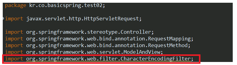import org.springframework.web.filter.CharacterEncodingFilter; ▲ 필터 인코딩을 서블릿에 등록하기 위해 bbsCont.java(현재 운영중이 controller) 에 위의 코드를 import 시켜주자